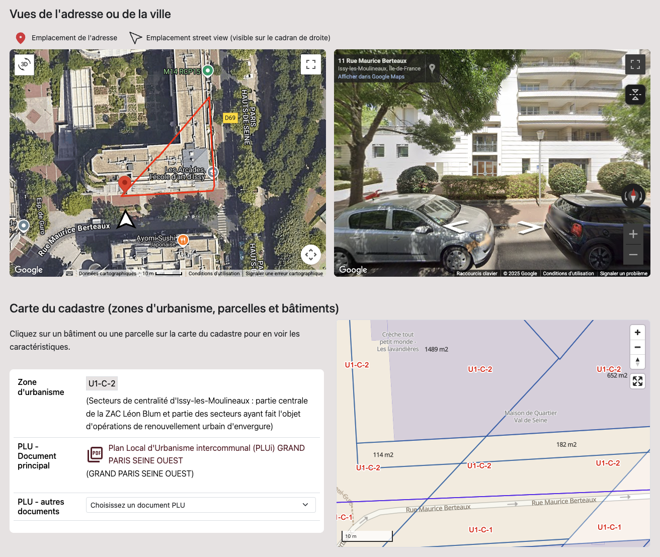 Entrez une adresse et retrouvez en un clic toutes les informations indispensables : vue satellite 3D, Street View, cadastre (parcelle, bâtiments), propriétaires, transactions, copropriétés, zone et documents d'urbanisme, DPE et commerces & services à proximité.