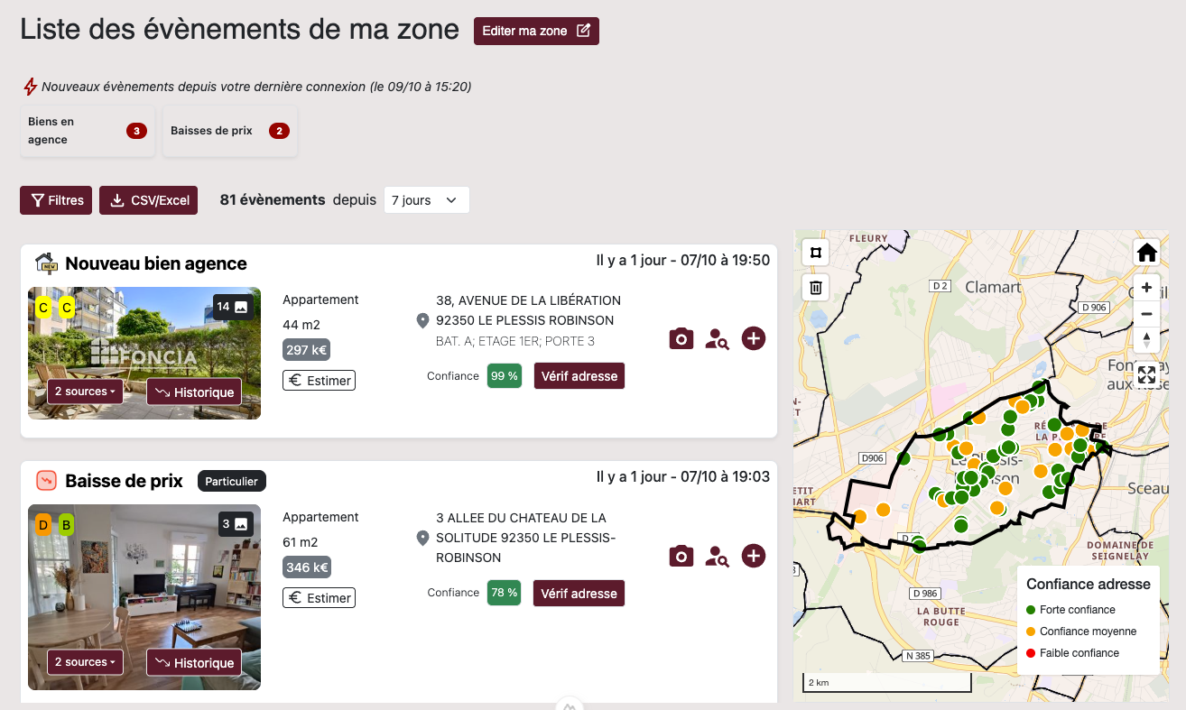 Grâce à notre outil de pige immobilière, retrouvez la liste automatique des opportunités de votre zone : nouveaux biens entrant à la vente, nouveaux projets à venir, baisses de prix sur les annonces immobilières de votre secteur ou sorties prochaines d'exclusivité.